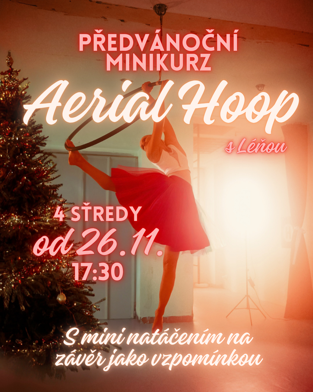 Teď máš ideální příležitost! Čekají tě 4 lekce plné ladnosti, síly a zábavy, které tě naučí základy aerial hoopu v bezpečném a přátelském tempu 🤩